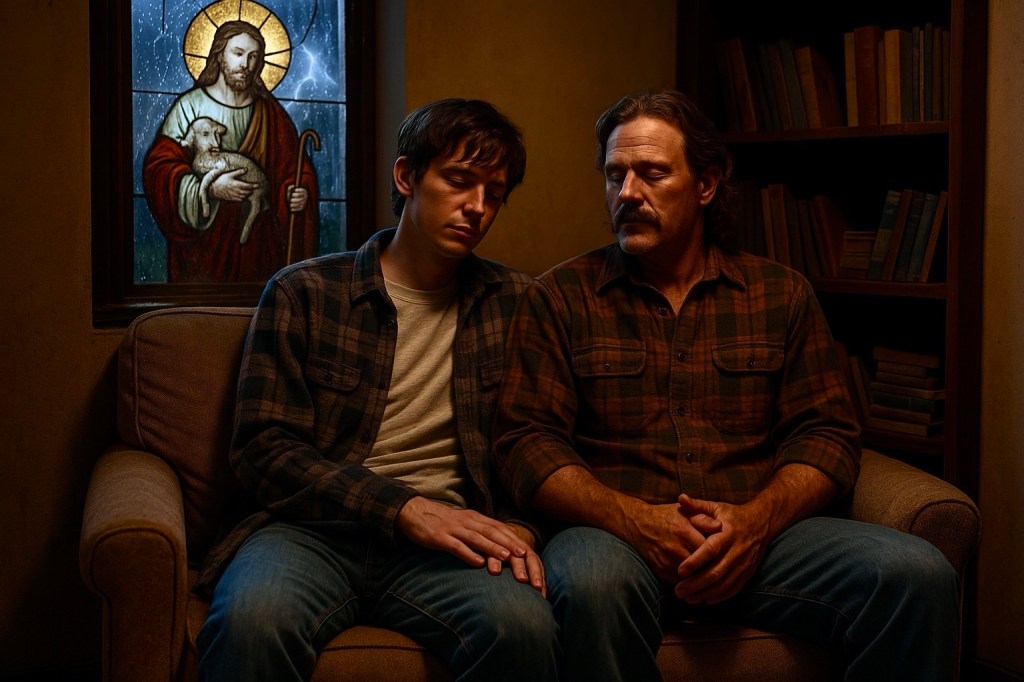 They settled into the little room off the back hallway—part storage, part prayer nook. A loveseat sat against one wall, old and sunken in places, and a shelf of dusty devotionals lined the opposite wall like forgotten psalms.