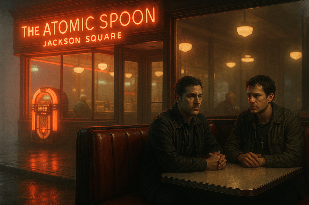 The Atomic Spoon’s red neon buzzed in Jackson Square, a bloody glow piercing the fog that clung to the windows like a living thing, its tendrils curling inward as if drawn by the warmth inside. The air inside carried the heavy scent of fryer grease and burnt coffee, undercut by a faint chemical tang from Y-12 that seeped through the cracked window frames, a scar of Oak Ridge, Tennessee’s buried history that never fully faded.
